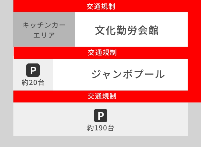 当日は、会場周辺の道路が一部交通規制されます。駐車の台数に限りがありますので、徒歩または自転車でのご来場にご協力をお願いします。