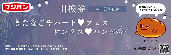 イベント当日に、対象の臨時駐車場、駐輪場を利用した場合、各駐車場先着100名様にフジパン株式会社より協賛いただいたネオバターロール1個/台をプレゼントいたします。